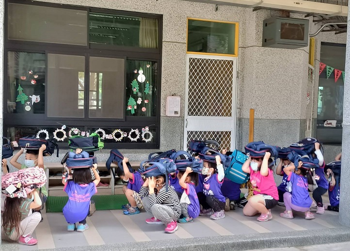 臺南市政府教育局演練突發四級地震致學生立刻就地避難掩護。(記者黃伃綵攝)