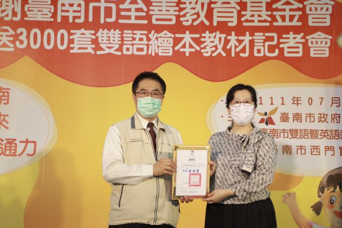 【民進日報記者黃伃綵台南報導】全台首學全英《論語》,由財團法人台南市至善教育基金會出資,台南市安平區西門實驗小學與國立成功大學合作編輯的「議題融入雙語教學繪本」上月完成編印,將捐贈3,000套共9萬冊的雙語教學繪本給南市各市立國小,讓品德教育與國、英語文教育「三」管齊下。今(22)日在西門實小舉辦至善基金會捐贈記者會,由市長黃偉哲代表南市府頒發感謝狀給基金會執行長林盈利,黃偉哲也期許這套繪本成為台南經驗,推廣到全國!