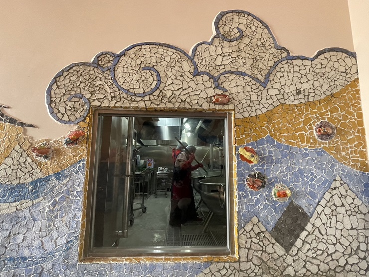北門國小中央廚房公共造景故事牆。(記者黃伃綵攝)