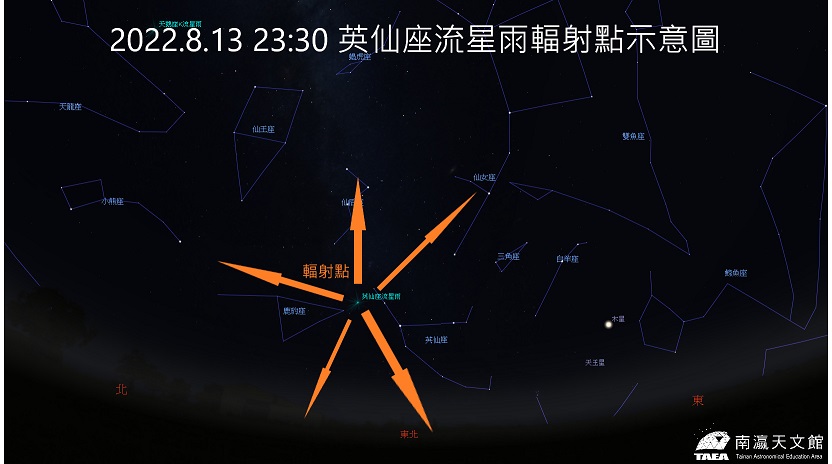 教育局鄭新輝局長表示,英仙座流星雨是每年夏季天文迷眾所期盼的特殊天象之一,今年極大期預計發生於8月13日、ZHR值預估為100,當晚輻射點約在晚上10時從北北東方向升起,當日月齡27接近朔月,南瀛天文館也預計辦理天文野台講座,及望遠鏡觀測當晚重要天體如土星、M13武仙座球狀星團、M57戒指星雲等,更有3場星空導覽解說,由南瀛天文館專業導覽員輪番上陣介紹夏、秋季的星座,活動無需報名、免費參加,歡迎全國對天文有興趣的朋友一起來參加這難得的星空盛宴!