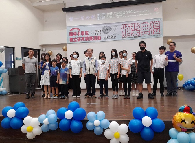 臺南市國中小學生獨立研究頒獎典禮第一名獲獎學生合影。(記者黃伃綵攝)