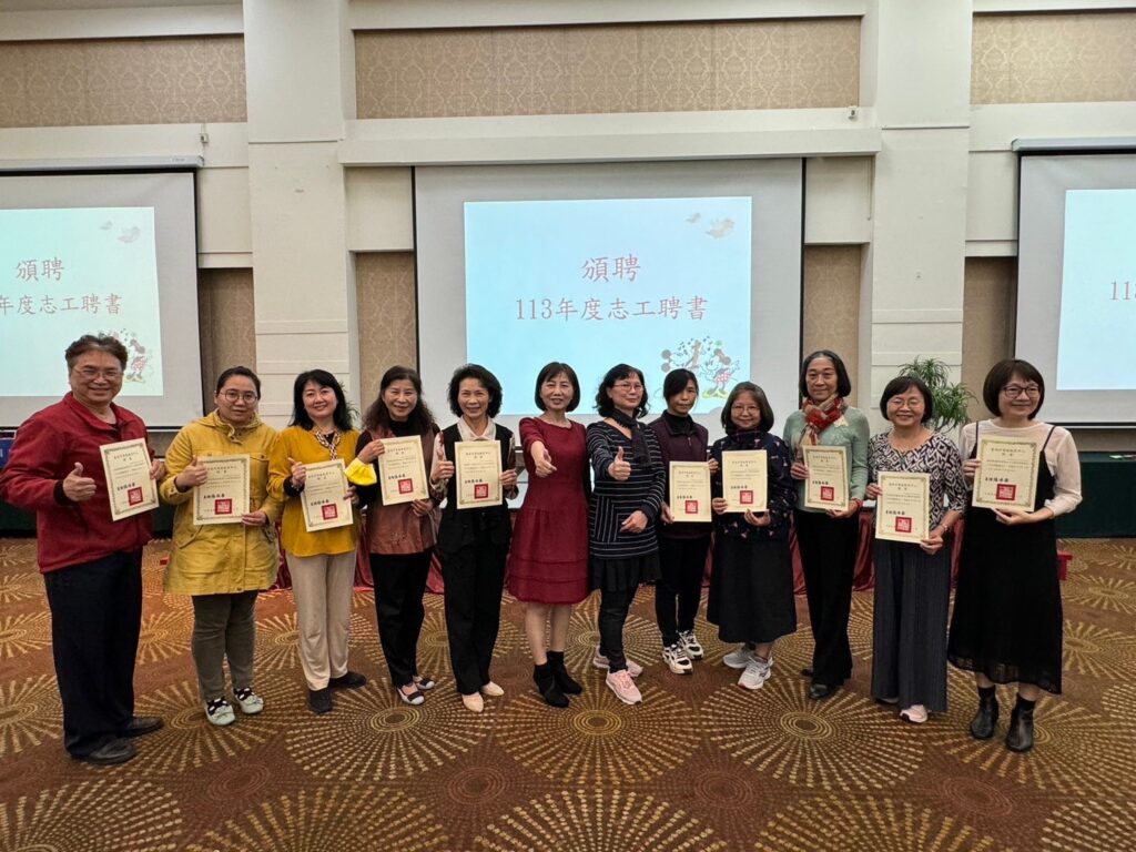113年度家庭教育中心主任張冰嫈(中)頒發聘出予初任志工王念騏(左五)等人。(記者黃伃綵攝)