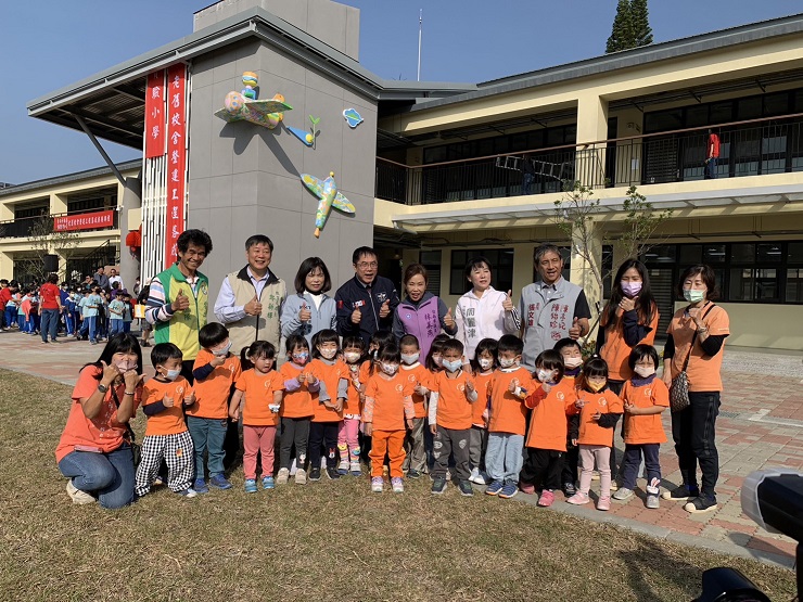王念湘校長表示,非常感謝在黃市長帶領的市府團隊協助下完成工程,新校舍融入在地人文特色,納入周邊建築與水交社文化園區元素,重簷式斜屋頂設計,配合空心磚造型、仿石塗料、米黃、橘、灰色系、鋼瓦與隔柵,打造出獨特飛行意象與古蹟元素的校舍風貌。校舍設計以班班獨立陽台為主,中間以大川堂銜接,挑高的通風設計、彩繪空心磚牆、樓梯開口的美感視角與彩色玻璃磚光影變化,實踐環境友善,讓師生能在健康、安全、美感的空間環境中學習與成長。