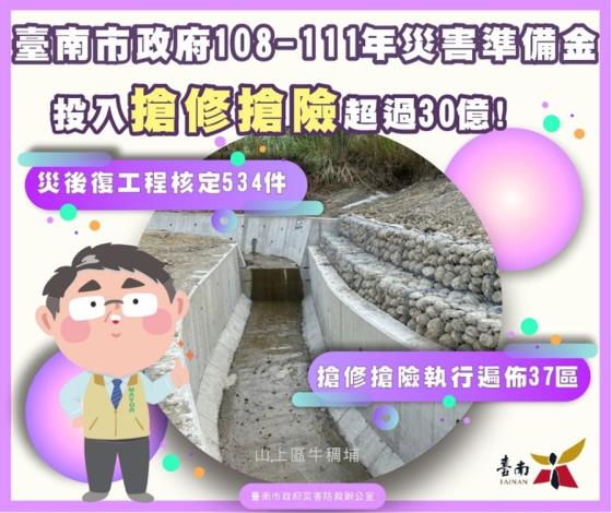 黃偉哲市長認為,面對全球暖化造成的極端氣候,除了震災、旱災、輸電線路災害以外,短延時強降雨更是屢見不鮮,而唯有居安思危,才能有備無患。黃偉哲市長上任以來,投入超過30億元積極推動安全無災大臺南,除了平時落實清淤疏濬、自主演習訓練及深耕防災意識宣導外,也非常重視災後復建工程,更想方設法兼顧工程品質與財政紀律,希望的就是能讓市民快速回復正常生活,從而發揮安定社會的功能,讓市民順心、放心更安心。