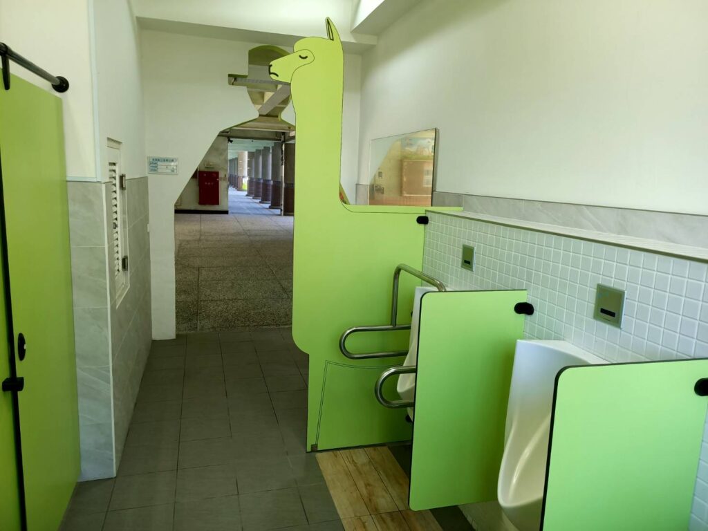 踏進佳里區信義國小的廁所,發現處處有野生動物,師生踏進來滿是驚訝。廁所設計以孩子們喜愛的動物意象做為規劃主軸,搭配明亮活潑的配色、營造獨特的廁間美感,校園廁所動物的選擇,更讓學生共同參與設計,除講究管線及光線外,出入口巧妙設計呈現男女生的外型,可立即辨認男女廁所,凸顯設計趣味性。廁所可以由動物保護作為起點,轉化為珍惜及愛,這也是信義國小對於動物議題的發想。