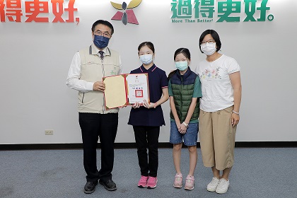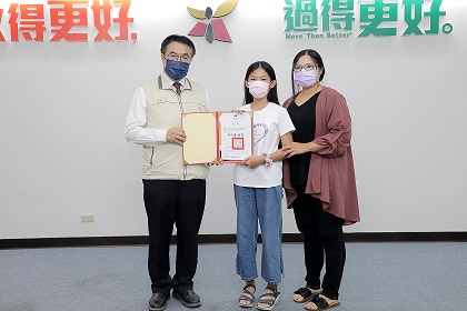 臺南市保西國小鍾沛岑(中)獲黃偉哲市長表揚。(記者黃伃綵攝)