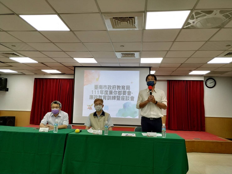教育局副局長王崑源致詞時表示,感謝各位夥伴們在教育第一線的努力付出,讓臺南市整體教育表現在全國名列前茅。本次會前政風室特別請業務單位提供實務工作上會遇到的具體問題,以利座談會時就教於檢察官,藉此讓課程內容對工作有實際助益,也期許同仁不僅要將今日所學內化,更要推己及人,擴大教育訓練的影響力,以落實本府以清廉為首的施政價值。政風處專門委員翁國銘表示,蔡檢察官辦案經驗豐富,請同仁把握難得機會,任何問題都可以提出來請檢察官提供法律意見,幫助大家安心從事公務。