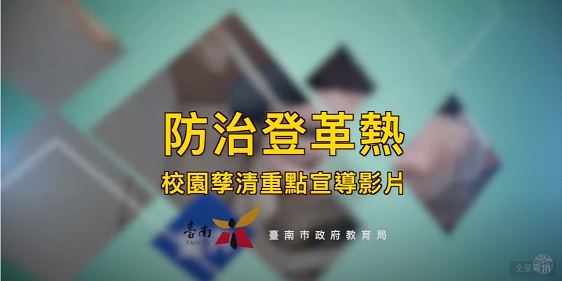鄭新輝局長表示,登革熱是環境疾病,防疫需全民動起來,特聘請專業人員拍攝校園登革熱防治重點宣導影片,期許師生人人皆是防疫專家,從守護校園進而守護家園,教育局後續還會推出完整版校園登革熱防治影片,歡迎各界踴躍運用與推播。首播3分鐘短版影片,提醒校園常見孳生源及維護管理方法,包含如水生植物、飲水機、咖啡機底盤、花盆底盤、廁所馬桶、地下室水溝、陰井、排水孔、洗手台、水桶、樹洞、工地、帆布等,相關影片已公布於南市教育局臉書粉專「教育花路米」(https://fb.watch/lLnj5Ja-Nv/),供學校運用。