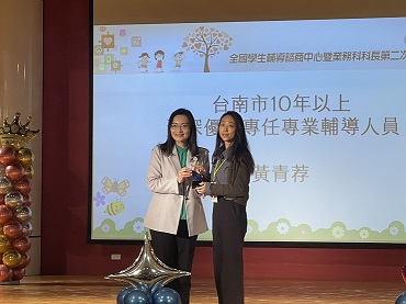 臺南市社工師黃青荐(右)獲全國資深優良專輔人員殊榮。