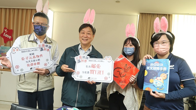 黃偉哲市長表示,「怕寂寞的兔子看過來」!春節活動期間來南瀛天文館的民眾,只要生肖屬兔,即可享有「套票買1送1」的優惠,讓您出遊結伴不寂寞!另民眾身上若有配戴「兔子元素物件」(如衣服兔子圖案或頭戴兔耳朵造型等),皆可享有「天文展示館免費參觀」的優惠,讓我們一起「兔年戴隻兔,到館瀛來富」!