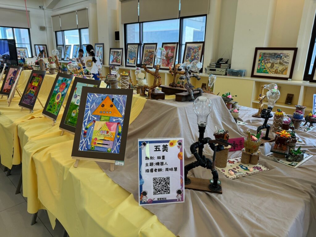 麻豆國小李貞儀校長表示,呼應「星際藝攻隊」主題,學生以廢棄物為基底加上多樣媒材打造獨一無二的太空飛船,以輕質土捏塑創意外星人及外太空陶燈與星球杯墊,還使用熱轉印和型染技法製作星際手提袋。展區作品創意十足,包括以多肉植物、博物館、海底世界等為題材的立體作品、水墨作品、工藝和黏土作品等,無不彰顯孩子的藝術天賦與努力。