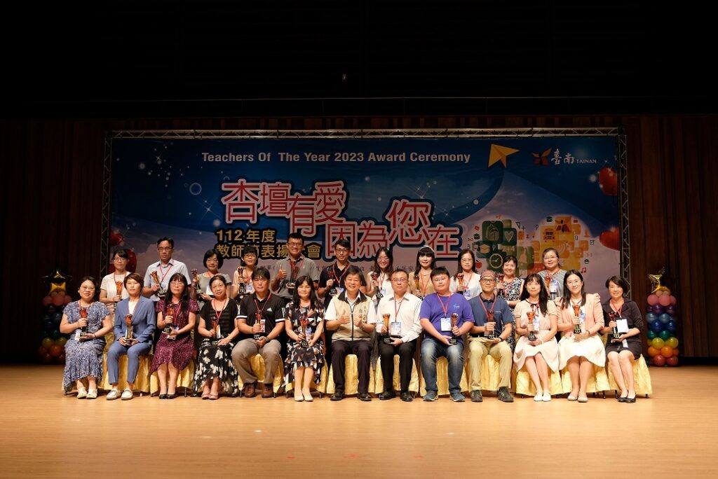 【民進日報記者黃伃綵台南報導】臺南市政府教育局新聞秘書吳幸樺表示,為感謝教師春風化雨,臺南市政府於樹谷園區音樂廳舉辦112年教師節表揚大會,表揚2位全國師鐸奬、4位全國教育奉獻奬、23位臺南市師鐸奬、9位優良特殊教育人員、20位服務滿40年、257位服務滿30年及595位服務滿20年資深優良教師。本年度以「杏壇有愛 因為您在」為主題,象徵教育路上親師生共同努力,用教育愛成就每一個孩子。開場表演由台南應用科技大學學生代表獻唱「星空」及「是因為你」兩首教師節主題曲,教育局鄭新輝局長代表黃偉哲市長蒞臨現場頒奬及合影,感謝教師為孩子們辛勤付出,陪伴孩子們學習成長。