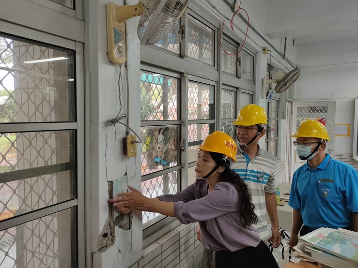 月津國小校舍災損勘查。(記者黃伃綵攝)