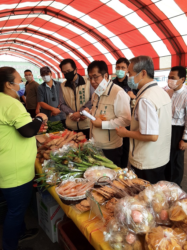 黃偉哲在李建裕及新聞處長蘇恩恩陪同向青農問候和採購農產品 。(記者蔡金旺攝)