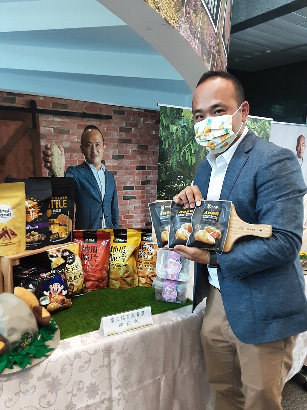 邱裕翔展示瓜瓜園熱銷國內外甘藷產品等產。(記者蔡金旺攝)