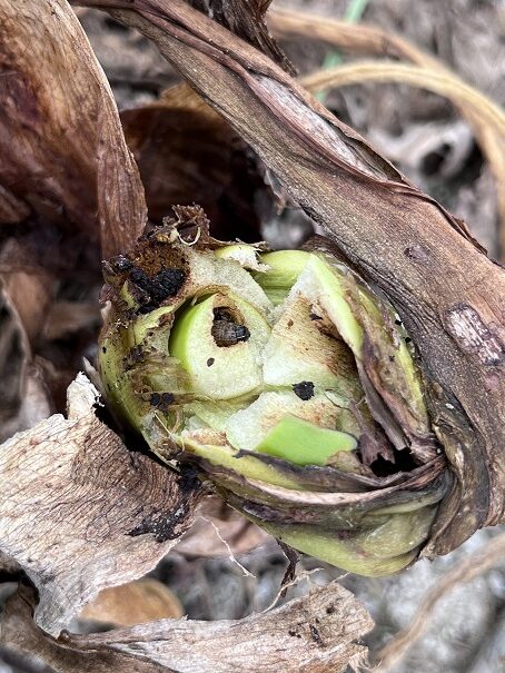 秋行軍蟲由芋頭葉部鑽蛀入地下莖。(記者蔡金旺攝)