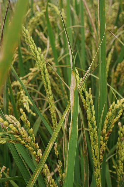 水稻罹患白葉枯病沿葉緣發展成波浪狀灰白色病徵。