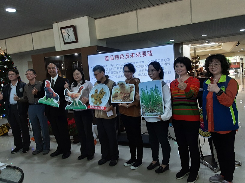 【記者蔡金旺台南報導】畜產試驗所於昨日在技服館舉行年終研究成果記者會,會中最能凸顯成果有培育出優良花畜鬥雞種雞、鬥雞母衍生商品烤雞、耐淹水牧草新品種狼尾草台畜草九號、及採用雞蛋白常溫即食蛋白丁產品,畜試所長黃振芳強調,畜試所研究人員將科學轉化成實用技術,再引領、輔助相關產業成長。
