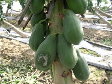 連續大雨造成田間積水及病害快速蔓延,日前在木瓜、柑橘果園及果菜類觀察到木瓜果疫病、柑桔類果實褐腐病及蔬果類疫病陸續發生等,這類病害農民俗稱「滾水病」、「水菇病」或「水傷」,由於土壤內的疫病菌藉由雨水飛濺傳播而感染,加上雨天環境中濕度高,加速病原菌侵染及而造成果實腐爛。