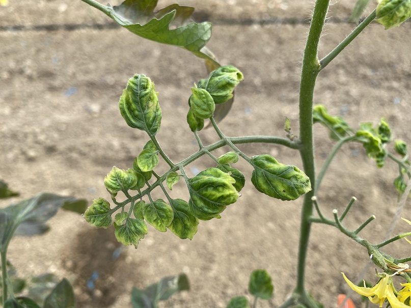 番茄病毒病造成葉片捲曲。(記者蔡金旺攝)