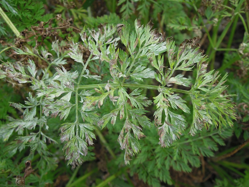 胡蘿蔔罹患白粉病造成葉片枯黃的象徵。(記者蔡金旺攝)