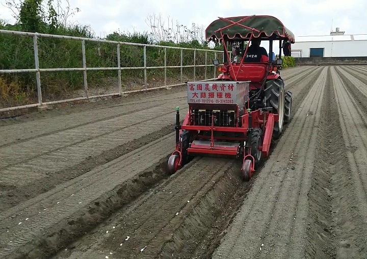 臺南區農業改良場開發完成附掛式大蒜種植機進行田間操作。(記者蔡金旺攝)