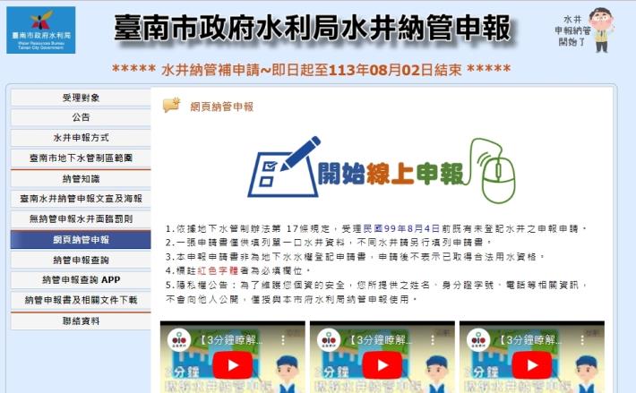 水利局進一步表示,在水井納管的申報網頁上,不僅有各種申報方式及納管流程的介紹,也包含臺南市政府辦理水井申報納管之緣由及各種好處、未來輔導合法階段是否收取相關費用等問題,民眾都可以透過瀏覽網頁了解,同時水利局更貼心地設置水井納管專線(06)6321212,透過專人為市民提供解說服務。