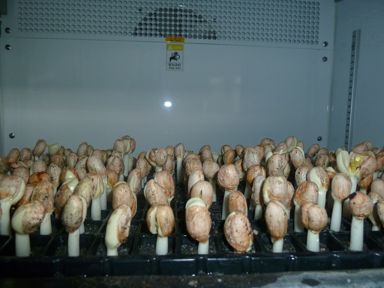 2.種子發芽:選用通氣容器及適量乾淨濕潤土壤、沙土或介質,平舖3?4公分厚的土壤或介質,將選好之種子芽點朝下(尖端朝下),每顆種子間間距約1~1.5公分插入土壤中,再將剩餘土壤或介質覆蓋2~3公分,並適度鎮壓使土壤或介質密實。