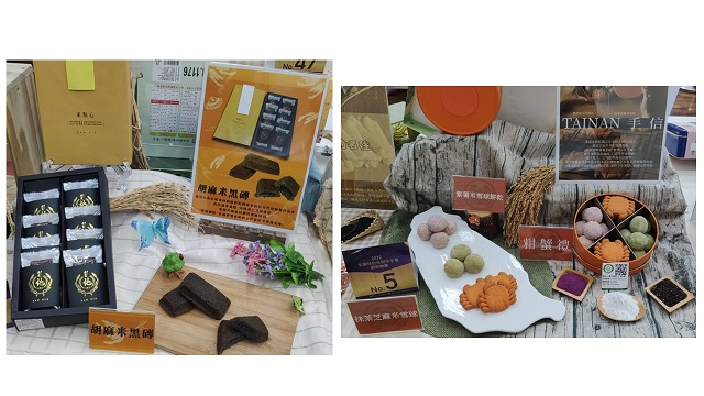 為鼓勵烘焙及食品業者運用米穀粉與地方特色食材結合,開發精緻且高品質之伴手禮於全國各地販售,農糧署於本(111)年度舉辦「全國特色米製伴手禮創意競賽」,吸引全臺34家飯店及烘焙業者,挑戰以51%以上國產稉米米穀粉融入烘焙應用,推出高達53項精緻可口、包裝時尚且攜帶便利的米製伴手禮參賽,經評選南區共有6款優質米製伴手禮盒獲選為優勝獎(詳新聞稿附件),朵朵心手工烘焙製造所於100 %米穀粉添加純蔬果粉,以最佳配方及加工條件捲出鮮豔外觀的「彩虹發餡米蛋捲」;恬米屋食品烘焙有限公司(恬米屋米蛋糕) 將夏季的特色農產融入純米製產品中,交織出稻香、米香和果香的府城禮讚「夏予之禮」(初夏糙香米餅、盛夏旺來(鳳梨)米磅蛋糕、仲夏農忙(龍芒)米費南雪);阿霞飯店所製的「粓蟹禮米餅鐵盒」以米穀粉與該店招牌菜螃蟹研製而成蟹禮起司米餅乾,另外紫薯及抹茶芝麻兩款米雪球餅乾更是下午茶絕配點心;丹莉厚工捲的「米你MINI禮盒」(海苔捲肉鬆/虱目魚鬆米蛋捲)使用雞蛋、不加水、100%米穀粉、府城市場的香酥豬肉鬆或臺南海味虱目魚鬆,獨家專利製程,捲捲手工用心,口口香脆好滋味;臺南市後壁區農會以該會與農民契作的產銷履歷益全香米(品牌:蘭麗香米)為原料,製成「米滿禮盒」,產品無麩質、無色素,能品嘗到純正米零食的好滋味;錦霞樓選用臺南在地食材胡麻搭配國產米穀粉及竹炭粉製作出「胡麻米黑磚(胡麻竹炭米蛋糕)」,中間夾上芝麻糖餡,提升胡麻的濃醇香風味與營養價值。