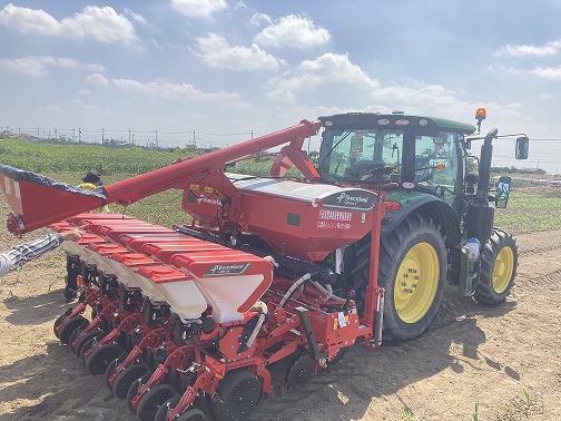 農糧署南區分署羅正宗分署長表示,目前現行田間播種使用之真空播種機具固定行距,而各種品項作物種植行距有所不同,需要更換真空播種機,以調整適合的行距才能進行播種。而本次輔導蔡文程農友引進的真空精密播種機,以油壓方式可隨時調整當下播種作物所須的行距,即使用該台真空精密播種機,就可進行多種品項作物的播種作業。除了調整行距之外,在行徑播種中亦可隨時調整作物株距,並結合GEOCONTROL應用程式避免重疊播種,人力、設備及資材上所投入成本大幅減少。