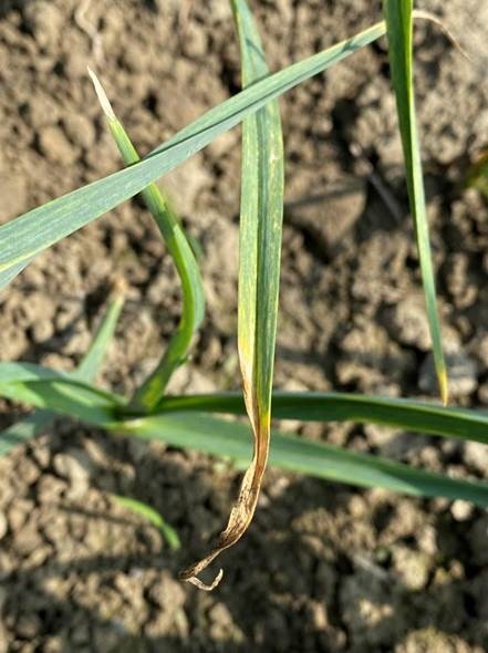 蔥科因罹患黑腐病造成葉尖黃化乾枯病徵。(記者蔡金旺攝)