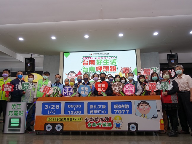 【民進日報記者凃政宏台南報導】為打造市長黃偉哲「希望家園」的施政願景,臺南市政府今(111)年首場大型徵才活動「台南好生活 台南呷頭路」Part1就業博覽會,將於3月26日(週六)上午9時至12時在善化區文康育樂中心辦理,共邀集台積電、台灣國際航電(GARMIN)、帆宣系統、瀚宇彩晶、啟碁科技、南科贊美酒店等83家廠商提供7,077個工作機會,其中有61家廠商提供4,337個超過3萬元以上薪資的職缺。今(23)日在新營民治市政中心1樓大廳舉辦2022「台南好生活,台南呷頭路」Part1就業博覽會行前記者會,黃偉哲市長、勞工局長王鑫基、南科管理局主任秘書林秀貞、柳營區公所區長陳玉惠、鹽水區公所區長陳文琪、善化區公所主任秘書胡勝陽、臺南市職業工會總工會理事長黃江福、大台南總工會理事長鄭山林、副理事長陳美靜、台南市職業總工會秘書長吳允昌、社團法人台南市勞工志願服務協會理事長梁志男、育德工家校長張榮修等多位貴賓親臨記者會,鼓勵求職者3月26日(六)一起來「台南呷頭路」。