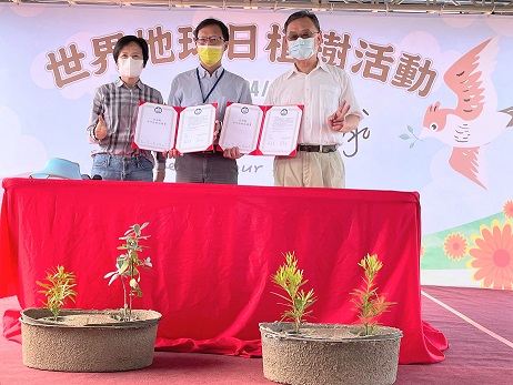 慈心基金會執行長蘇慕容(中)與澎湖縣長賴峰偉(右)簽約合作種樹造林。