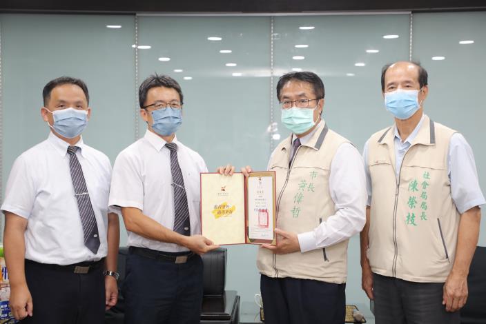 【民進日報記者凃政宏台南報導】近日COVID-19確診者遽增,台南市實物愛心銀行提供一次性物資,幫助低收入戶確診者度過居家隔離期間的需求,近期實物愛心銀行的物資需求大增,社會局積極媒合民間資源,由鴻仲生物科技有限公司、豐成建設開發有限公司響應愛心,捐贈民生物資一批,台南市長黃偉哲回贈感謝狀,感謝鴻仲生物科技董事長張靖明,以及豐成建設董事長王智民,支持南市照顧弱勢優先之施政理念。