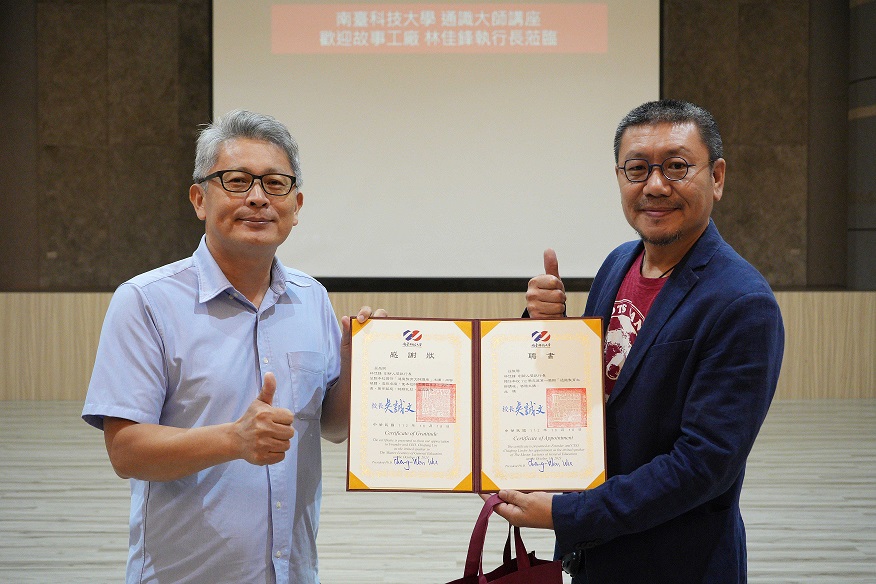 南臺科技大學通識教育中心主任薛清江(左)於通識大師講座特致贈聘書及紀念品予故事工廠執行長林佳鋒(右)。(記者黃伃綵攝)
