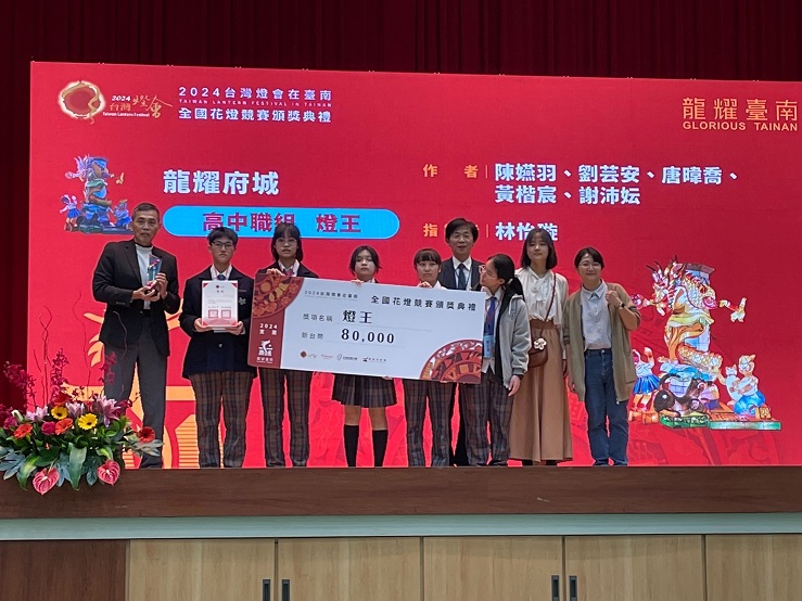一舉榮獲國中組、高中職組雙燈王,也是歷年全國燈會花燈競賽常勝軍的光華高中校長張敬川表示,燈王作品「快樂龍」、「龍耀府城」,象徵遊樂園的小龍們,踩著滑輪飛耀而上,而古廟前的龍柱,則留著舊時的回憶。