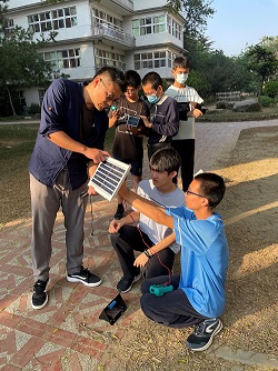 福智高中智造社社團同學學習量測太陽能燈之電壓電流。