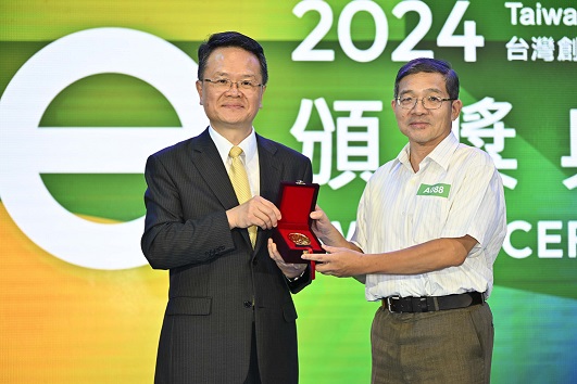 南臺科大金牌獎作品「積木辨識裝置」:由經濟部智慧財產局局長廖承威 (左)頒發金牌獎座予本校電機工程系黃基哲副教授(右)。