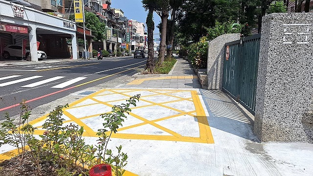 永信國小校長吳博明表示,此次步道改造除了針對原有不平整的鋪面進行修整,撤除所有階梯,並增設引導磚與定位磚,全面打造無障礙步行環境。同時,工程保留了原有的大型喬木及綠帶,發揮遮蔭、吸塵及微氣候調節的功能,讓綠意與步道相互交融。為提升行人穿越的安全性,校園周邊重新繪製行穿線,設置庇護島、導盲行穿線及行人專用號誌,確保學童和一般行人的安全。此外,步道沿線增設四處避車彎,提供機車臨停的空間,滿足家長接送及社區居民的使用需求。