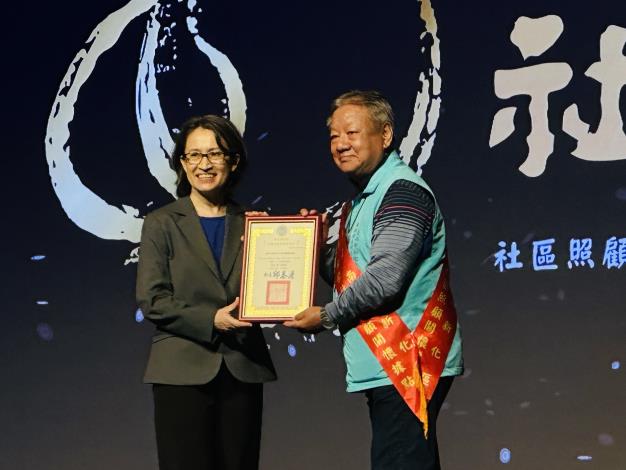 新化區東榮社區照顧關懷據點執行長趙阿明接受副總統頒獎。
