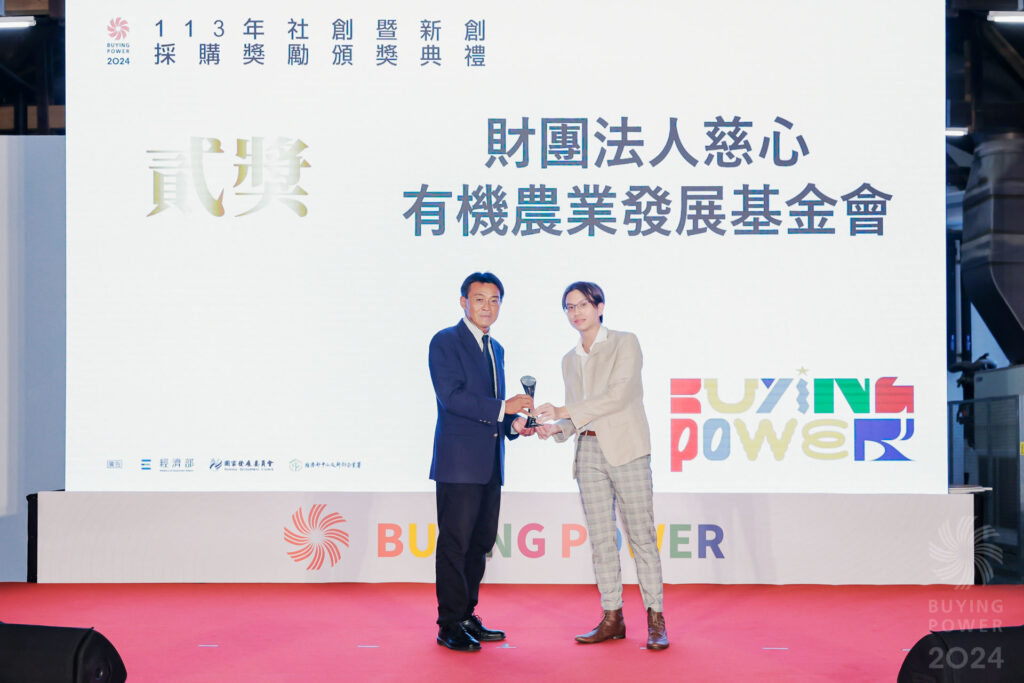 經濟部中小及新創企業署署長李冠志 (左) 頒發 Buying Power 貳獎由慈心種樹專員丁玉峰 (右) 代表領獎。
