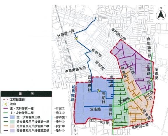 水利局表示「仁德污水下水道系統第二期工程主、次幹管」共計3標,主要範圍大致以東門路三段、中華東路三段及崇道路以南、鐵路以東及敬修街以西圍成之區域,除前述範圍外,另包含沿仁德區保生東路、文華路二段至仁德水資源回收中心之主幹管部分,其中主次幹管第一標已於111年竣工;主次幹管第二標已於112年開工,並預計於114年完工。