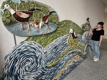 「山水之羽」藝術牆以西拉雅國家風景區的壯麗山水為靈感,將月牙形馬賽克拼貼成山巒起伏與河流流動的意象,展現如烏山頭水庫般蜿蜒水域與四周群山的和諧美景,水雉鳥輕盈掠過陶板上細緻刻劃的菱角田,呈現水雉一生與自然生態的共生畫面,藝術融入了山水的靈動之美,傳遞地方生態的豐富與文化的深厚,喚醒人們對自然環境的珍視與守護之情。