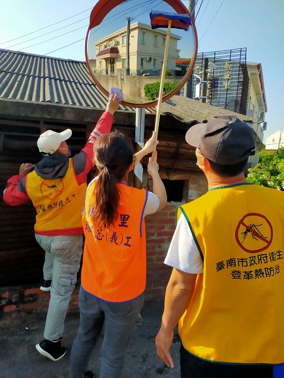 陳朝家帶領防疫志工守護社區環境衛生,並擦拭里內反光鏡,提升道路安全。(記者蔡金旺攝)
