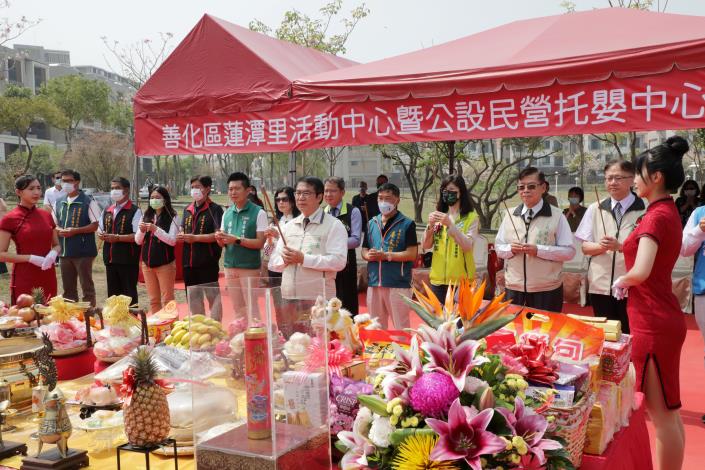 【民進日報記者凃政宏台南報導】台南市政府今(14)日舉行善化區蓮潭里活動中心暨公設民營托嬰中心動土典禮,興建的二層樓建築物將設置禮堂、辦公室及公設民營托嬰中心,預計113年完工。台南市長黃偉哲親臨會場,上香祈求工程一切順利,以提供當地居民一處多功能休閒及幼兒托育場所,給予蓮潭里更完善的福利設施與生活品質,台南市副議長林志展、議員陳碧玉、李文俊、李偉智皆親自出席,表達支持。