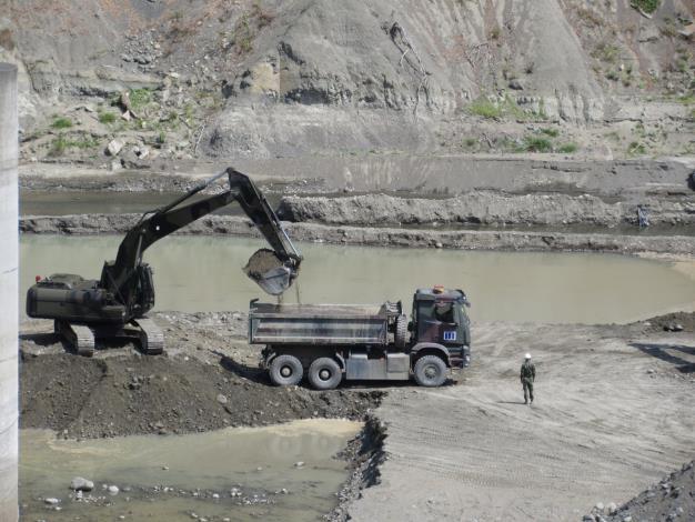 陸軍第八軍團所屬五四工兵群假日不停工協助水庫清淤。(記者蔡金旺攝)