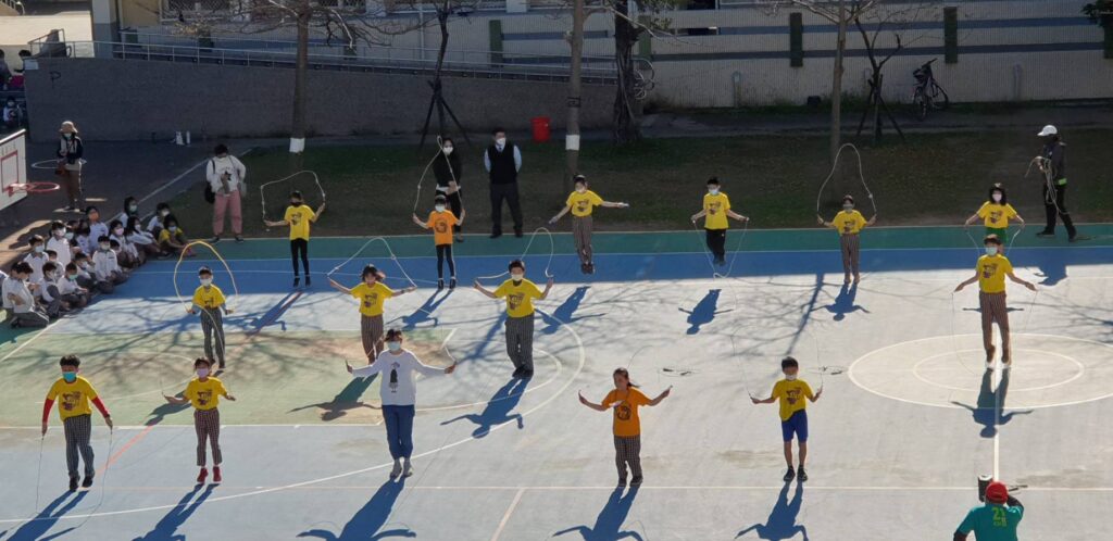臺南市日新國小學生戶外跳繩。(記者黃伃綵攝)